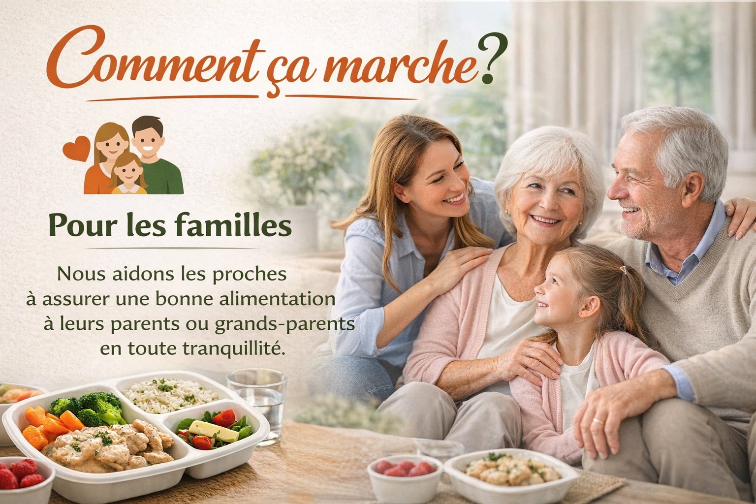 Nous aidons les proches à assurer une bonne alimentation à leurs parents ou grands-parents en toute tranquillité.