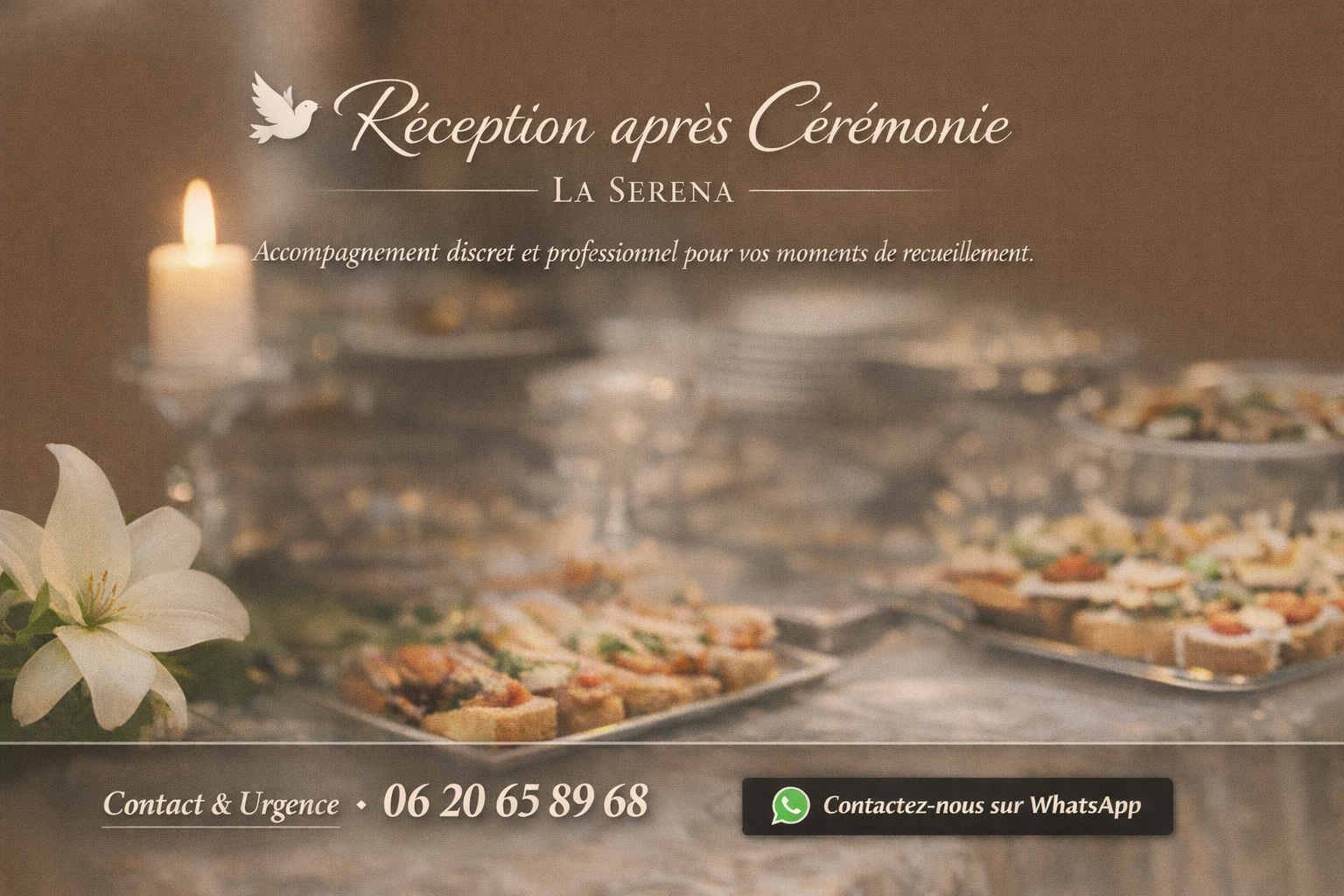 La Serena – Traiteur & Événement vous accompagne avec discrétion, respect et professionnalisme pour l’organisation de votre réception après cérémonie.